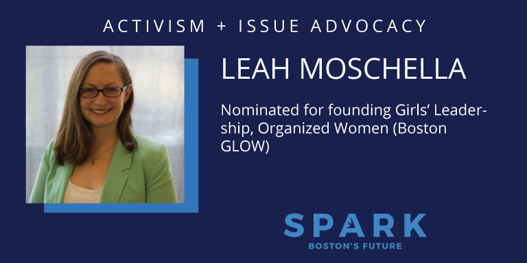 Leah Moschella founded Girls’ Leadership, Organized Women (Boston GLOW) 8 years ago with a mission of providing a supportive place for women and girls to share resources, build community, and increase their skills. Since its founding, GLOW has provided 54 high school-aged Girl Leaders in Boston with financial scholarships and hundreds of young women with leadership training.