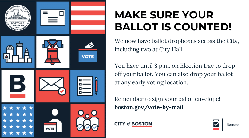 By including our brand colors, icons, and branded City logos, we ensured that the ballot dropboxes would be recognizable as official City of Boston assets. They were available 24 hours, seven days a week at 17 locations across Boston and were used by people all over the City. This dropbox design became a visual representation of the 2020 election, and democracy in action in Boston.