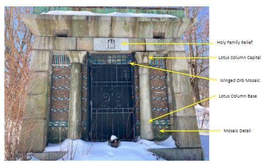 Framing the crypt’s door are two lotus capital columns. In the Poole/Boyko tomb, both the capital and base of the columns are imprinted with the image of closed lotus buds. (Today the lotus is more commonly referred to as a water lily.) Above the door is an engraved winged globe, which was an ancient Egyptian symbol of royalty, power, and divinity.