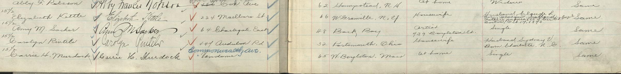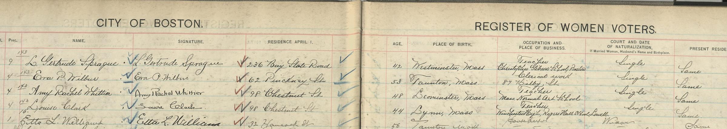 Newly registered voters in 1920 included women connected to the Boston Normal Art School in different ways: 22-year-old student Gladys Lynch (living at the Franklin Square House), teacher Amy Rachel Whittier, and graduates Zelpha Plaisted and the newly married Kathryn Nason Piston.