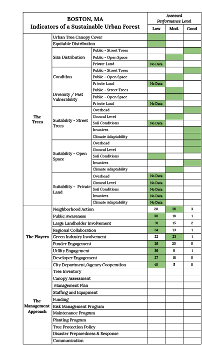 The discussions resulted in wide-ranging comments and ideas about the status and future of both the public and private tree canopy. From each discussion topic, themes emerged and are presented below. Overall, the majority graded Boston in the Low category across the indicators, except for Neighborhood Action, Green Industry, which scored Moderate.