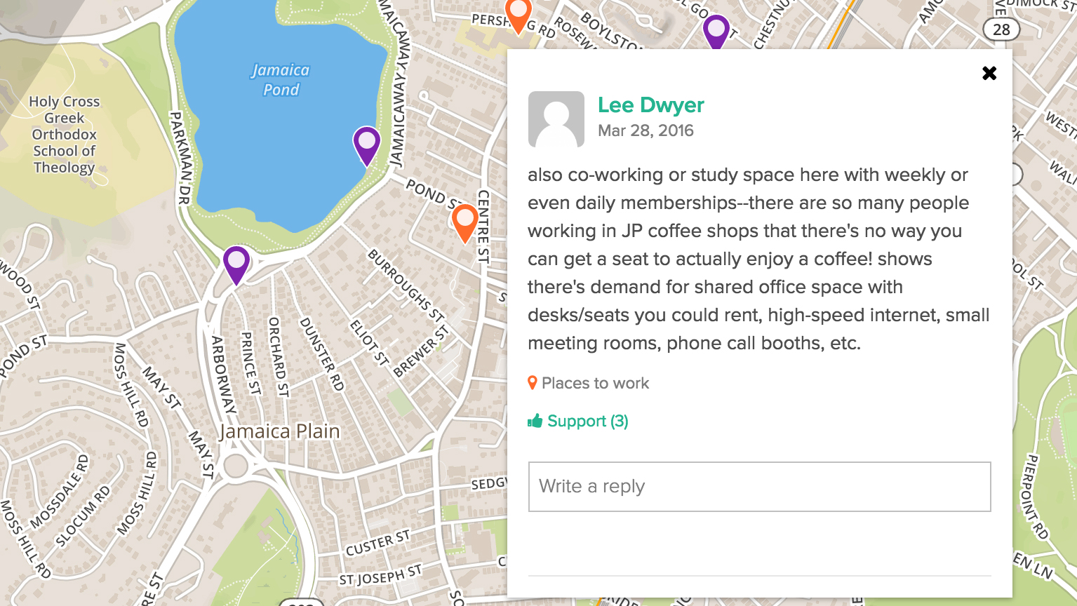 - “A mixed development space that would include a maker space, artist co-working, business co-working, meeting/event space, small business office space, a cafe and restaurants.” (Eileen, Jamaica Plain)