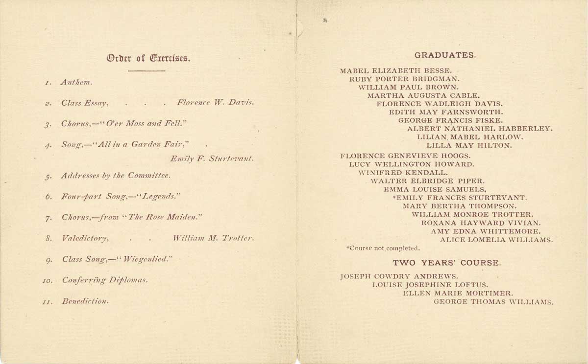 William Monroe Trotter was born in 1872 and lived in Hyde Park. He attended Hyde Park High School, which at the time, was a predominately white school. The 1890 graduation exercises below show that he gave the valedictory address to his fellow classmates.