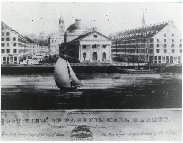 The site for Faneuil Hall Market had long been a gathering place for Boston’s merchants and peddlers. In 1824, Mayor Josiah Quincy led a massive project to “extend” the market and build formal market buildings to house stores and stalls for Boston’s merchants.