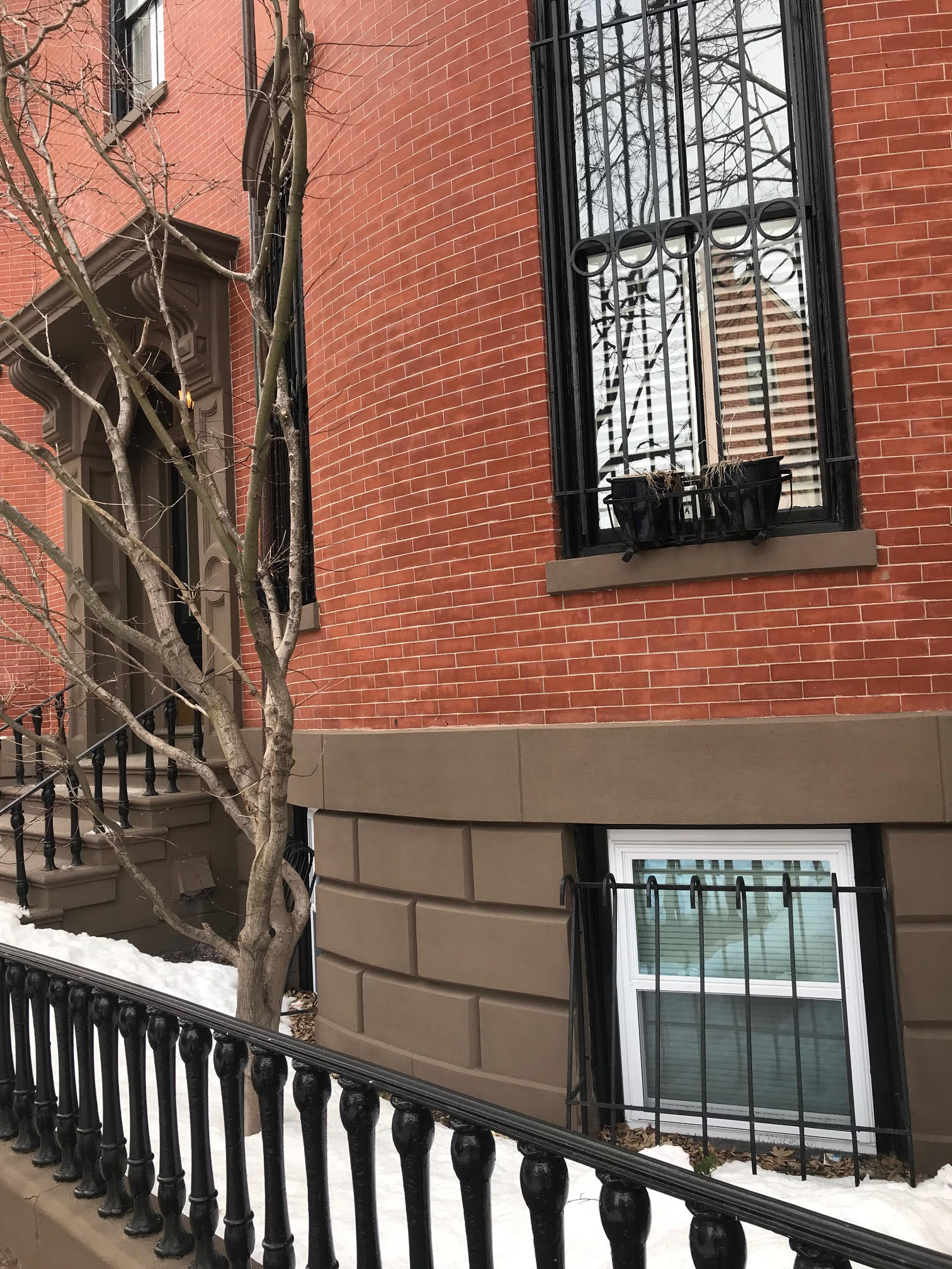 18.1532 SE 31 Concord Sq: At front façade, garden level, repoint brick. Repoint front steps in kind.