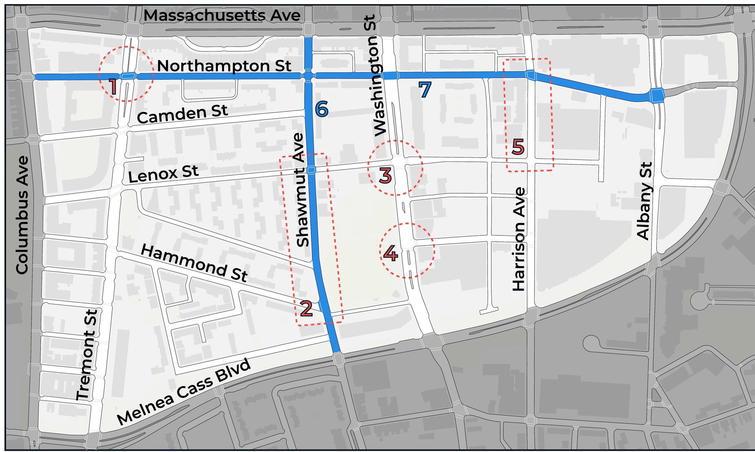 The project area is bounded by, but does not include Columbus Avenue, Massachusetts Avenue, and Melnea Cass Boulevard.